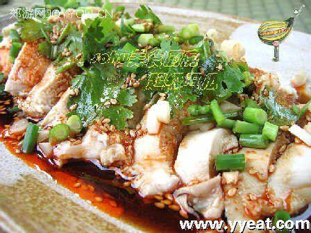 5)将酱油,盐,糖,醋混合两勺红油,搅拌均匀后,淋在鸡肉上面。根据你自己的口味,可以配一些香菜,香葱,芝麻。如果没有,不加也行!