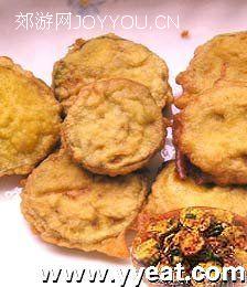 3、锅置旺火上,放油烧至六成热,将茄块逐个放入全蛋糊内粘裹均匀(挂糊),放入油锅内炸至成熟捞出,待油温回升六成热时,再将全部茄饼倒入重炸至金黄色时捞出装入盘内。