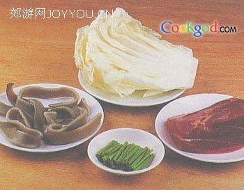 材料:嫩牛肉200克,白菜50克,山芋粉条50克,葱20克