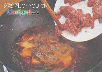 6、大火把汤烧滚后,放下牛肉片划散至熟。