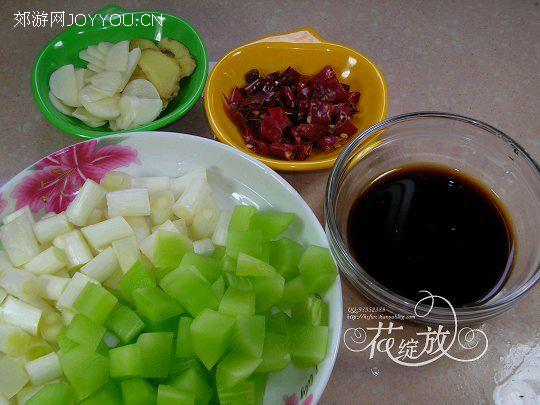 1、莴笋去皮后切丁;大葱白切一厘米长的段;老姜、蒜切片;干辣椒切一厘米长的段;将酱油、醋、白糖、味精、一半淀粉、三大匙水同放一个碗里兑成滋汁。