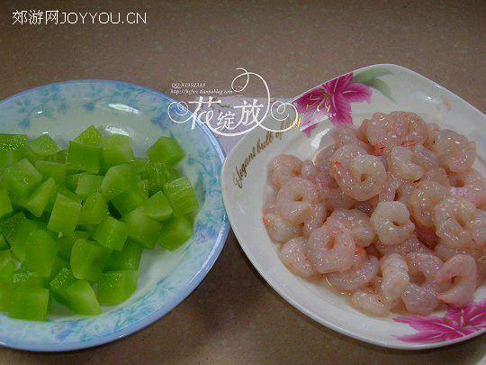 2、将虾仁去沙线后洗净,放另一半淀粉、盐、料酒拌匀码味约十五分钟;莴笋丁里放盐拌匀腌约十五分钟。