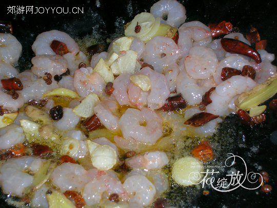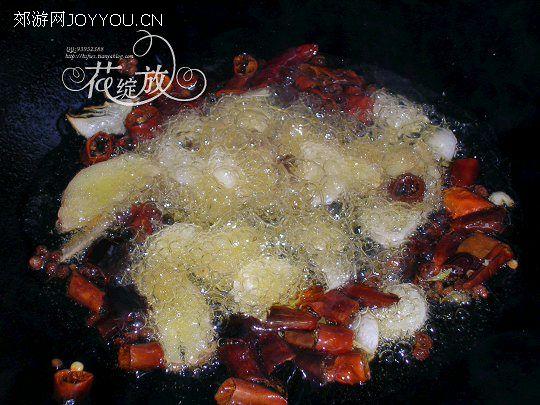 3、锅中放油烧至六成热,依次下花椒、干辣椒段、姜、蒜片爆出香味炒。