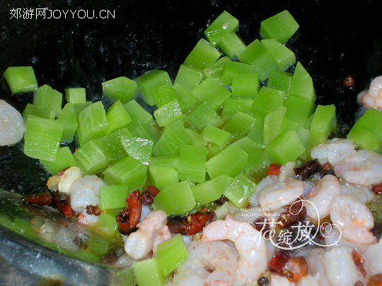 5、将虾仁推至锅边(也可以盛出),滗去莴笋丁中的腌汁后倒入锅中翻炒约半分钟。