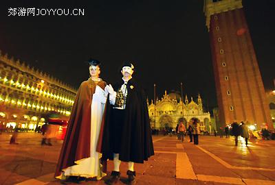 2月8日,一对情侣身着传统服装在威尼斯圣·马可广场上留影。