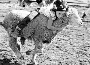 9月5日,在美国爱荷华州,为期三天的美国第14届牛仔竞技表演(Rodeo)即到来,图为一男孩率先上场与绵羊亲密接触一番。