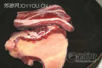 先把肉在开水中稍微煮一下,把浮血和脏东西煮出来。