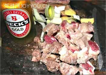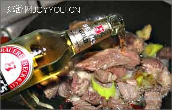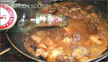 然后倒进牛肉爆炒一下,有红酒的就可以放一点,非常香,等都均匀暴炒过了,马上到一半啤酒接着炒一下。