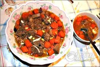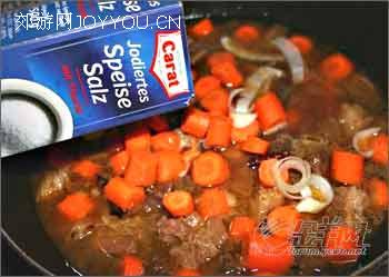 又煮了很长时间以后,这时候牛肉马上就熟了,把胡罗卜块到进去同煮,这时候在放盐,提前放盐,牛肉会紧缩,不容易熟。