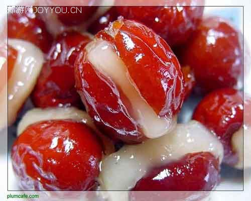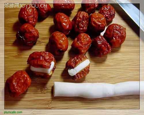 1)糯米粉小半杯用温热水和成面团,无核红枣洗净,用剪子剪开一下(发现一颗有核的,被我给当场消灭),然后,把糯米面团搓成条,用刀切成跟红枣长短差不多的小粒儿,然后塞进红枣里。