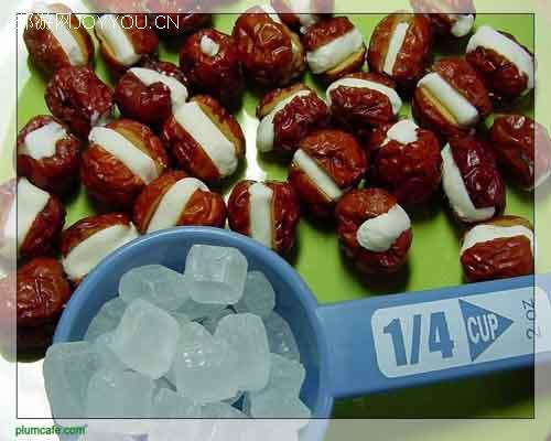 2)全部塞好以后,准备一些冰糖,根据自己喜好的甜度来调整数量吧。我用了1/4杯,觉得有点儿太甜了。