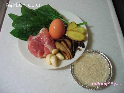 材料:去骨鸡腿肉、香菇 (家中整朵香菇刚好用完,所以临时拿切好丝的香菇干充充场面:)、青菜 (任何一种青菜都行,我是用菠菜)、姜片、蒜、辣椒、白米、芝麻油。