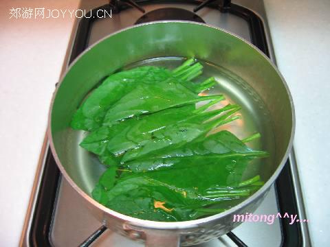 水烧开后才把青菜放入锅里,烫一下就好(別烫得太久唷)也就是青菜开始变的较翠绿时(约几秒钟时间)即可马上捞起。
