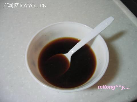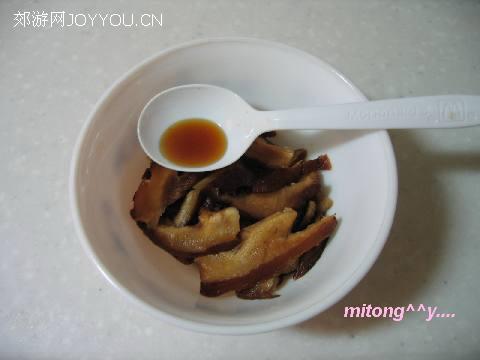 把整朵香菇泡软后切成两片或三片,再用刚刚调好的酱汁约2~3汤匙拌匀调味备用。
