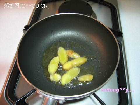 锅热倒入芝麻油,中小火慢煸姜片,千万不可用大火爆香喔!因为会把姜片爆出苦味(切记),如果没有芝麻则用炒菜油也行,只是芝麻油比较香一些)