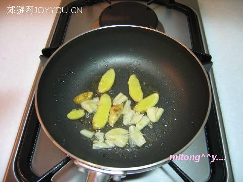 等姜片微干时就把拍扁的蒜头放入锅中爆香,这时的火就可以开在一点了,喜欢吃辣的可以加进辣椒一起爆香。