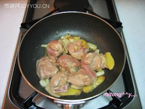 姜、蒜都爆香后接着把鸡肉放入锅中煎。