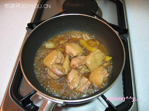 过几分钟后水约烧成八分干再打锅盖放入鸡肉。