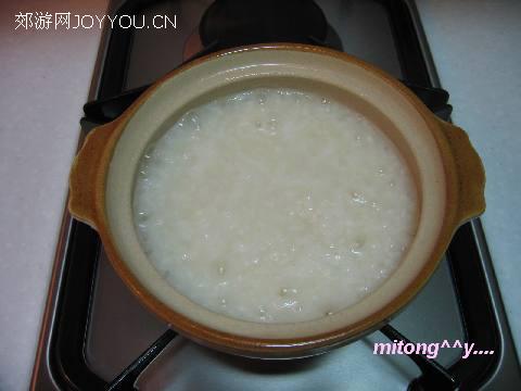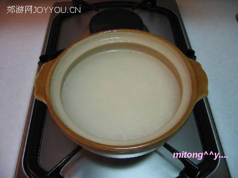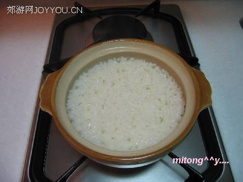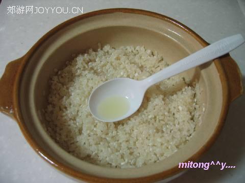 把白米洗净放入砂锅,并加入一点点炒菜油搅拌均匀。