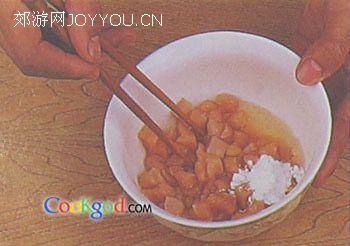 1、鸡丁放碗里加盐、黄酒、味精、鸡蛋、生粉均匀拌和上浆。