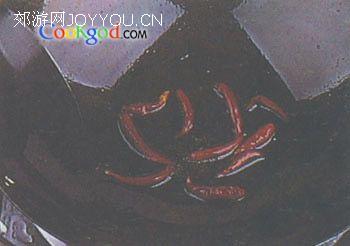 4、锅中留油20cc先下干辣椒煸至棕红。