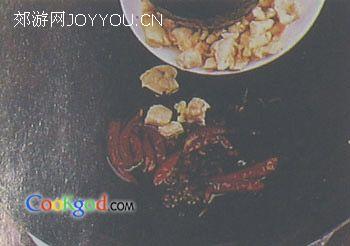 调味料:干红辣椒5克,生粉15克,花椒15粒,酱油10cc,黄酒5cc,白糖10克,醋10cc,盐2克,味精2克,油300cc(耗50cc)