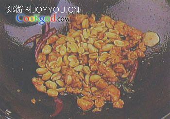 6、倒入调味兑汁翻炒均匀,再加入花生米拌和。