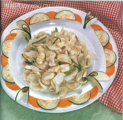 主 料: 活虾婆(琵琶虾)2只约300克,鲜百合200克,芹菜20克,鱼露10克,味精5克,麻油2克,生粉10克,生油500克(耗油50克)。 做 法: 1、先将虾婆用清水洗净,用刀在每只虾婆背部切开,取出其肉,再用刀切成大片,以两片相连(即用飞刀片法处理),然后用大碗盛着待用。鲜百合拆瓣,用剪刀剪去赤黑边,取其净白部分,洗净待用;芹菜洗净去掉菜叶,留存枝茎,用刀切段待用。2、将炒鼎洗净,烧热倒入生油,待油温约180摄氏度时,把虾婆肉加入生粉拌匀,放入鼎内,用油炸过,倒起;再把炒鼎放回炉位,放少量生油,将百合放入鼎炒热,然后加入鱼露、味精、麻油、芹菜段和虾婆肉一起炒拌均匀上餐盘即成。 特 点: 清鲜爽嫩,风味独特。