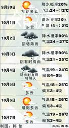 10月1日多云25~32℃10月2日阴转阵雨24~27℃