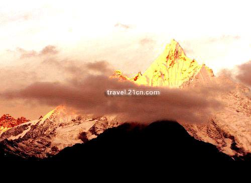 绕着佛塔按顺时针的方向我们转了三圈之后,主峰卡瓦格博的尖顶露出了一点点淡红色。传说中,期待中的日照金顶就从海拔6000多米的卡瓦格博开始。尖顶从淡红色变得越来越红,雪山边延的天空有了朝霞的红晕,随着时间的推移,红色变成了金色,照在雪白的山顶,发出耀眼的金光。而那日照之下的金光也逐渐从卡瓦格博漫延至神女峰、将军峰、五冠峰,直至整个梅里雪山的十三座山峰都戴上了金冠。站在佛塔前,面对人间如此美景,唯有感叹与无言!